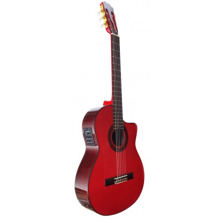 Guitarra flamenca con fondo de sicomoro, una madera similar al cipres. Tapa de abeto con golpeador. Amplificada con ecualizador y afinador. Con cutaway